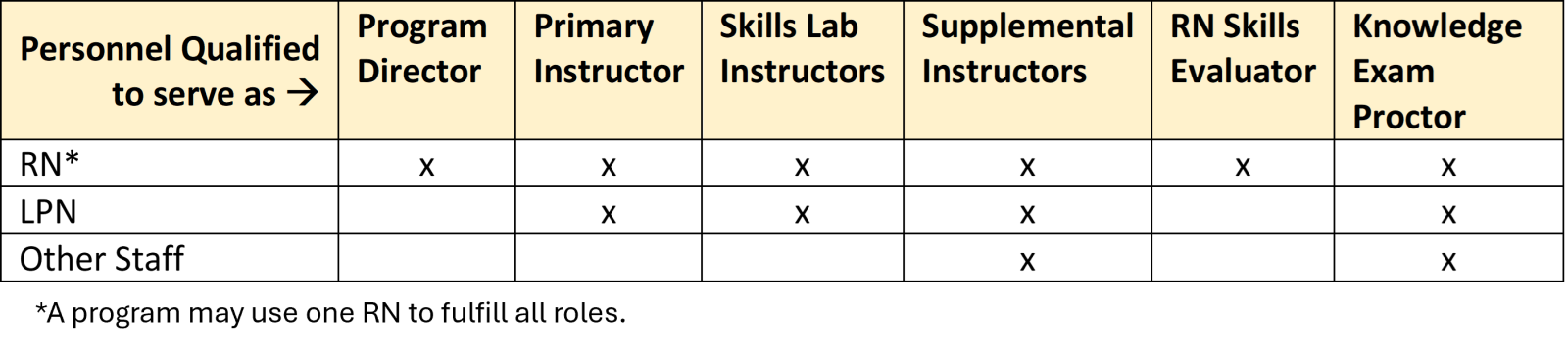 - Primary Instructor(s): actively licensed RNs/LPNs with two years of licensed clinical nursing experience, with one year of licensed nursing experience in a nursing facility; must have experience teaching adult students or completed a training course on adult instruction. The director of nursing (DON) in the nursing facility is not eligible.